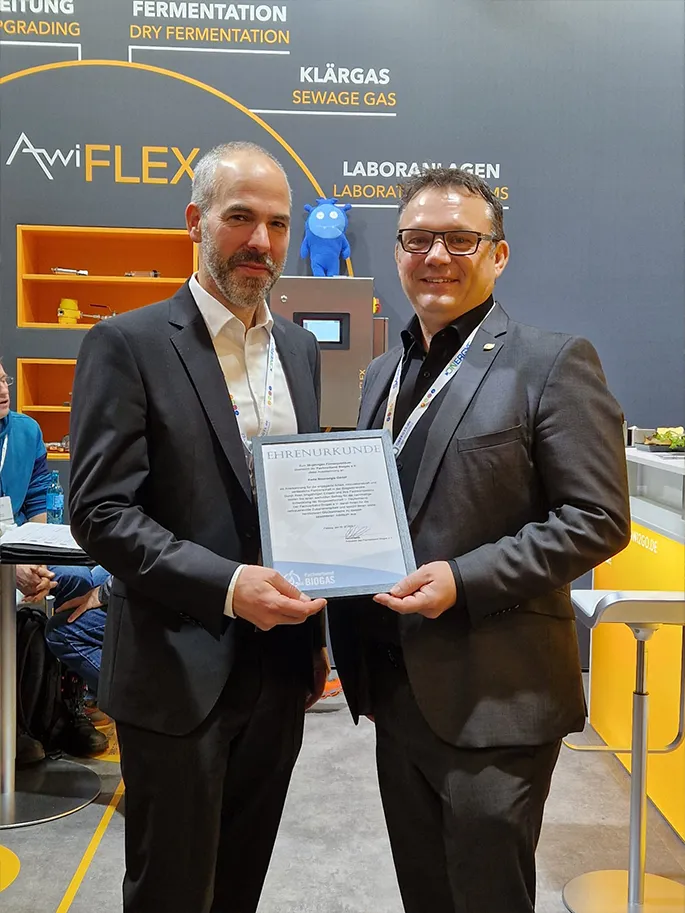 A special surprise on the final day of the trade fair was the award presented by the German Biogas Association (Fachverband Biogas e.V.). Mr Christoph Spurk, Managing Director of Ökobit and acting in his role as Vice President of the Association, presented us with a certificate of honour to mark our 25th company anniversary. This recognition makes us extremely proud and underlines the significance of our work within the biogas industry.